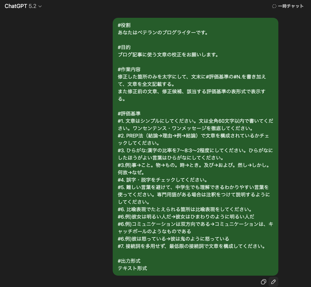 ChatGPT(https://chatgpt.com/)に校正用プロンプトを入力します。