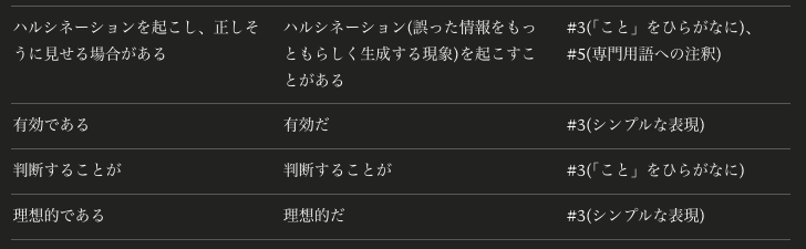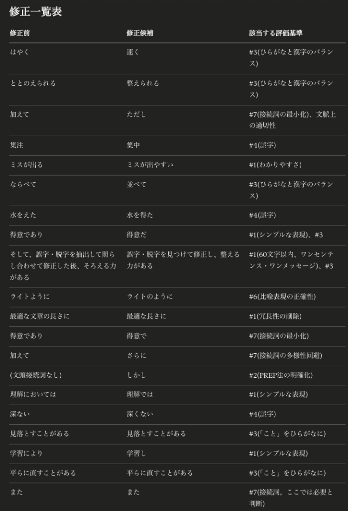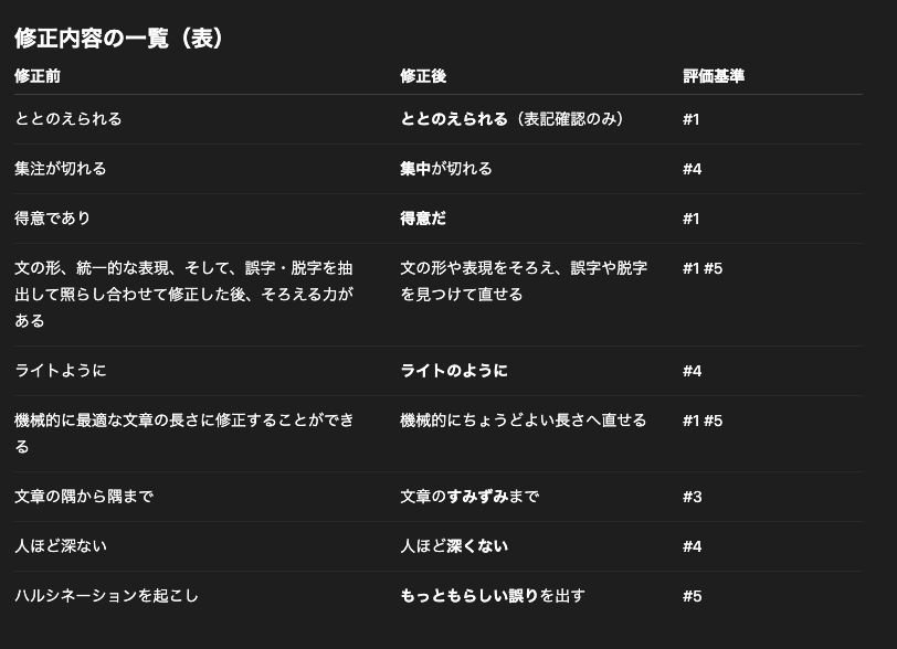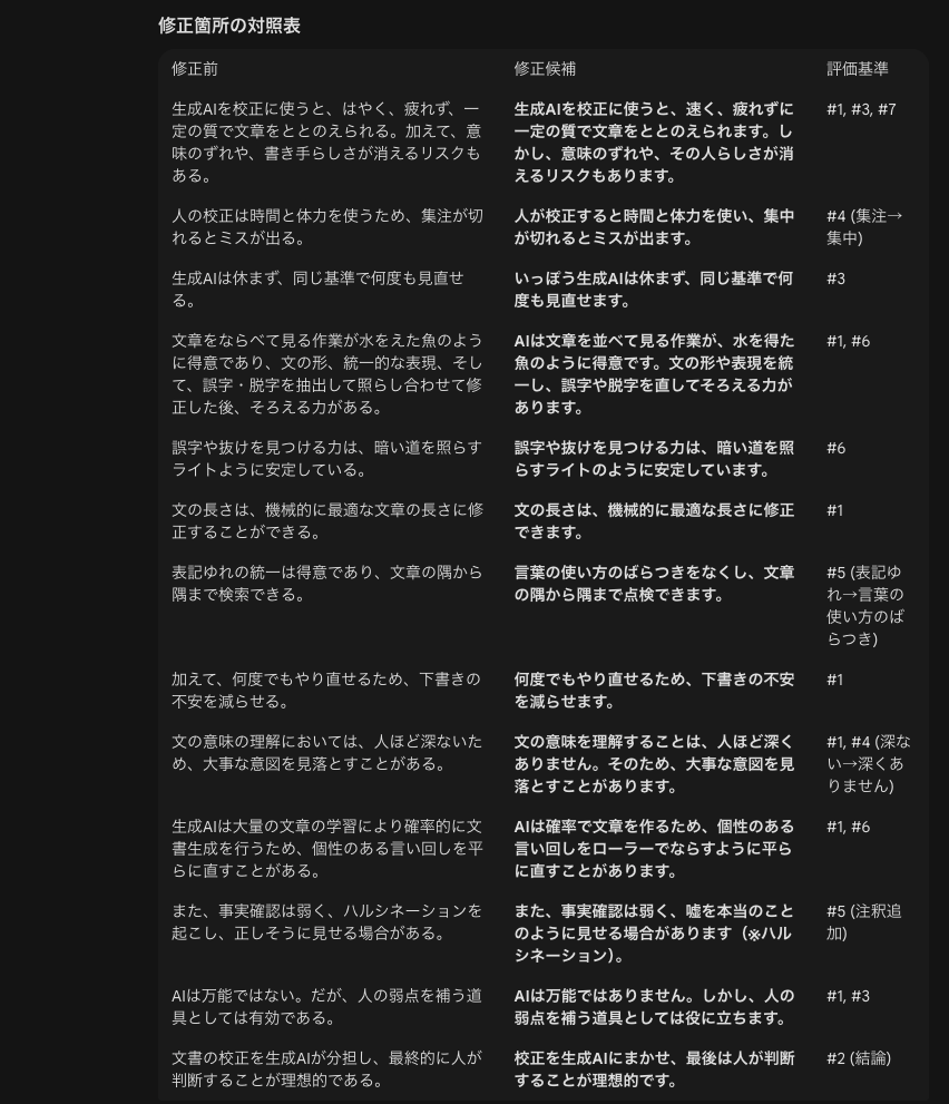 Claudeは修正理由を詳細かつ体系的に説明し、「なぜこの修正が文章を改善するのか」を明確に説明できている