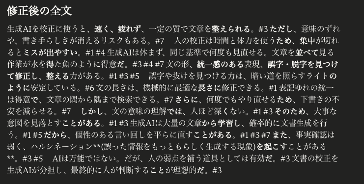 人の校正は時間と体力を使うため、集注が切れるとミスが出る。生成AIは休まず、同じ基準で何度も見直せる。文章をならべて見る作業が水をえた魚のように得意であり、文の形、統一的な表現、そして、誤字・脱字を抽出して照らし合わせて修正した後、そろえる力がある。